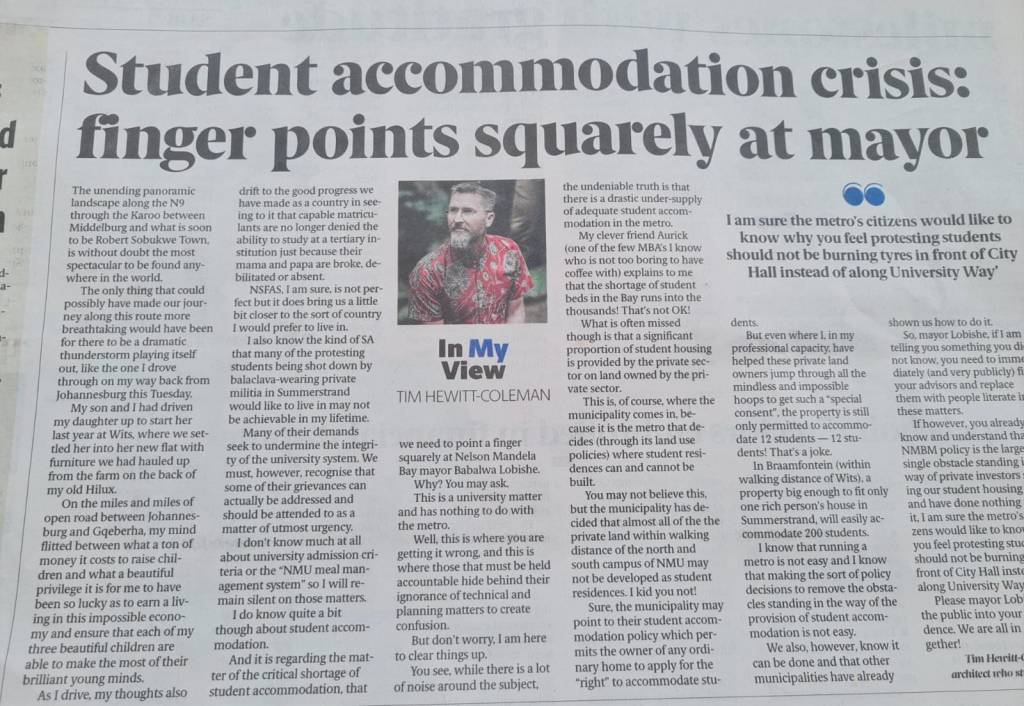 You see, while there is a lot of noise around the subject, the undeniable truth is that there is a drastic undersupply of adequate student accommodation in the metro. My clever friend Aurick (one of the few MBA’s I know that are not too boring to have coffee with) explains to me that the shortage of student beds in the NMB metro runs into the thousands! That’s not Okay! What is often missed though is that a significant proportion of student housing is provided by the private sector on land owned by the private sector. This is of course where the NMBM comes in, because it is the metro that decides (through its land use policies) where student residences can be built and where they cannot be built. You may not believe this, but the NMBM have decided that almost all of the all of the private land within walking distance of the north and south campus of the NMU may not be developed as student residences. I kid you not! Sure, the NMBM may point to their student accommodation policy which permits the owner of any ordinary home to apply for the “right” to accommodate students. But even where I, in my professional capacity, have helped these private land owners jump through all the mindless and impossible hoops to get such a “special consent”, the property is still only permitted to accommodate 12 students. 12 Students! That’s a joke. In Braamfontein (withing walking distance of Wits), a property big enough to fit only one rich person’s house in Summerstrand, will easily accommodate 200 students.