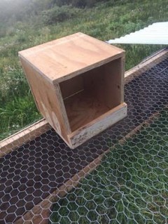 A simple design of 300 X 300 boards cut from a 19 mm Shutterboard sheet. A little plank across the front to keep the eggs and nesting material in. Then simply screwed into the side wall of the Chicken Tractor.