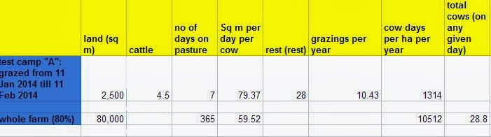 Ran some stocking density calculations based on Allan Savory’s method (and as discussed in plain English by Joel Salatin) So if I were to observe that my 2500 sqm camp “A” has a weeks grazing for 4,5 cattle (three full grown and three calves) after resting for 28 days, then I would be able to extrapolate that the whole 10 ha would be able to carry 29 head of cattle. The following inputs apply: